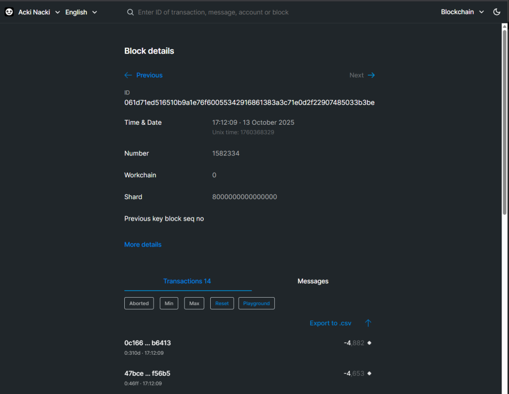 Integrated directly into the Acki Nacki RPC and verifier mesh, it visualizes blocks with complete metadata: block hash, producer ID, number of transactions, gas usage, and timestamp, all finalized under the chain’s “two-round” probabilistic consensus.